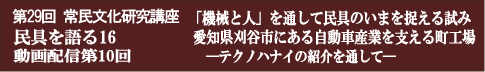 第29回常民文化研究講座 民具を語る16(動画配信第10回) 渋愛知県刈谷市にある自動車産業を支える町工場 —テクノハナイの紹介を通してー 花井亨壮氏(聞き手 加藤英明)公開