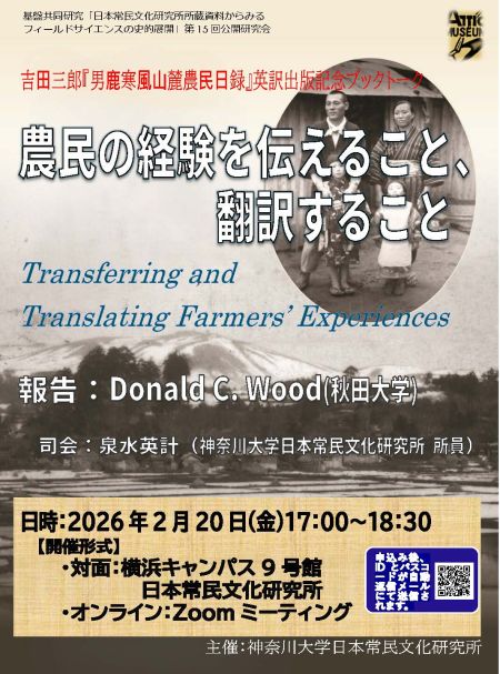 この共同研究では、研究所が所蔵する民族学振興会資料とアチック写真・フィルムを主な基礎資料とし、研究会と調査を行なっています。今回は、吉田三郎『男鹿寒風山麓農民日録』英訳出版を記念して、ブックトークを開催します。ご興味のある方はぜひご参加ください。