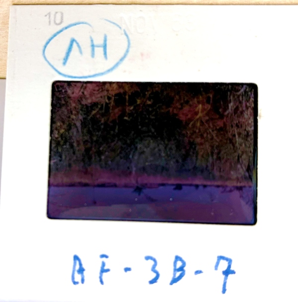 写真1 マウント付きフィルム(上部に、「10」の印字、「NOV 63」の刻印、青鉛筆の手書きで逆さ「HV」、下部に青マジックペンの手書きで「AF-3B-7」とある)
